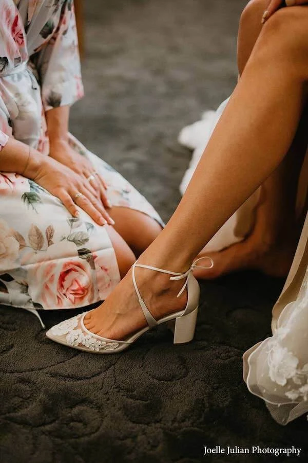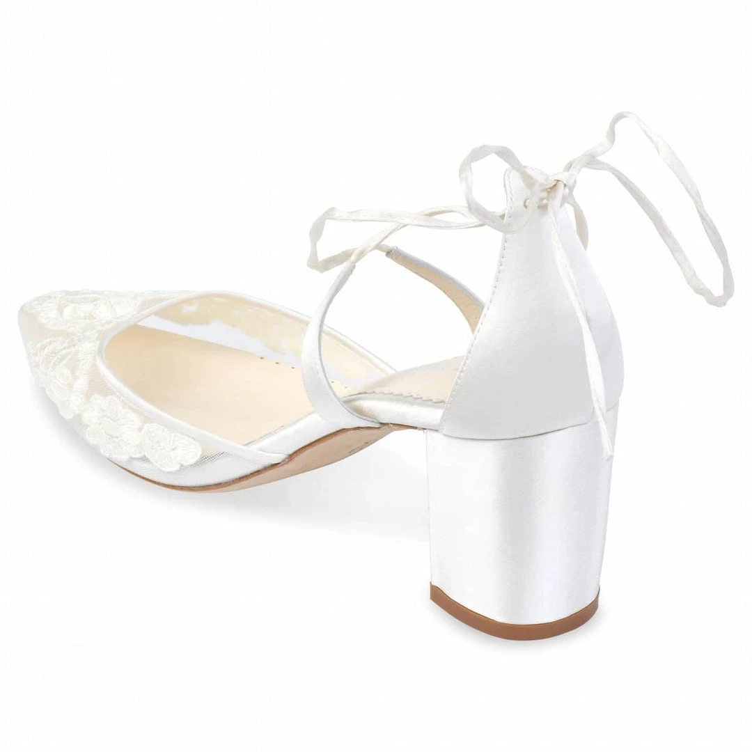 You’ve never seen classic and chic ivory floral block heels until you’ve seen Abigail. Abigal features a hand-sewn illusion mesh upper graced with delicate Alencon lace. The cross ankle straps and lovely tied bow at the heel cups provide a secure finish and add a feminine touch to these romantic block heel wedding shoe lace sandals. To top it off, the heavy padding ensures all-day comfort. Abigal block heels are perfect for walking on grass!