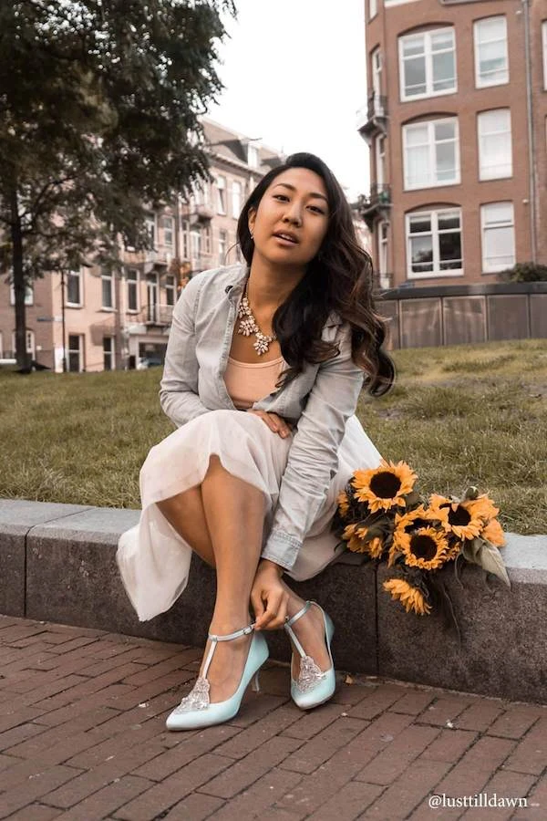 Our Annalise Blue vintage style wedding shoe is from Bella Belle’s ‘Eternal’ bridal collection. These Art Deco wedding shoes are inspired by Great Gatsby glamor, so it’s only natural that these blue kitten heel wedding shoes are hand embroidered and beaded with baguette crystals, strings, and glass beads to bring you back to the opulence of that era.