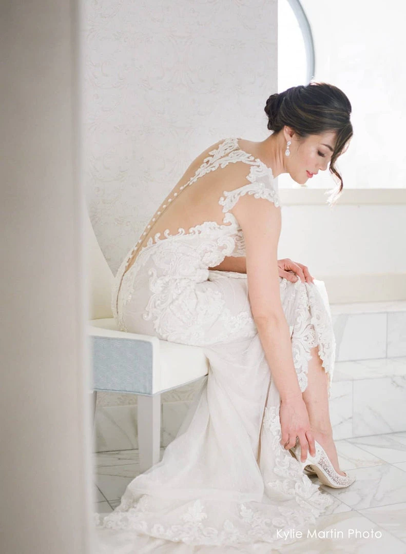 Evelyn Ivory sparkly kitten heels are from the Bella Belle ‘Euphoria’ collection. These ivory kitten heels feature hand-beaded sequin dégradé and embellished crystal Strass. The result? A beautiful shimmer effect. Evelyn Ivory sparkle kitten heels are a modern take on Cinderella’s glass slippers.