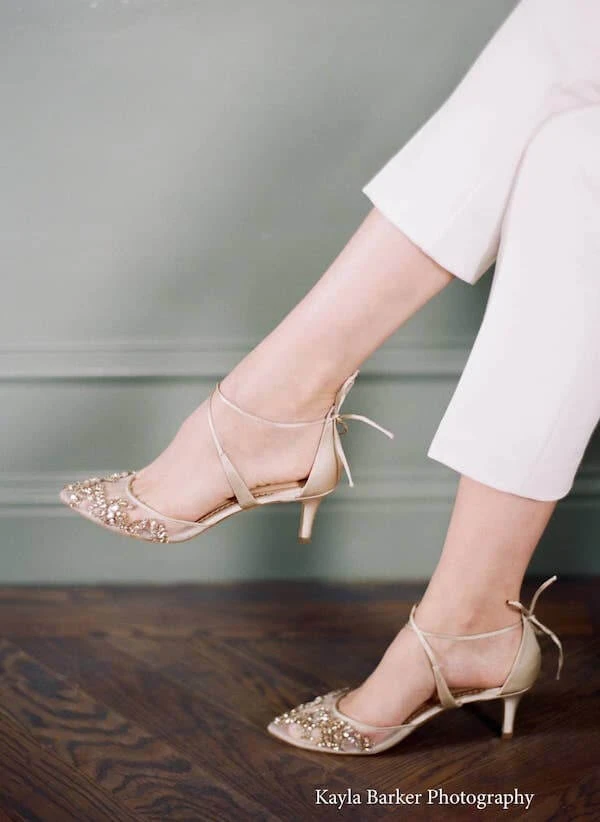 Frances Gold kitten heel shoes are from the ‘Euphoria’ collection. These champagne gold shoes are hand beaded with soft gold teardrop stones and beads that sparkle and shine like diamonds. Perfect as wedding wear or champagne evening shoes, Frances Gold low heel dress shoes are designed for comfort. Cross ankle straps and tied bows at the heel cup provide a secure fit. With intricate beading, luxurious crystals, and extra padding for all-day comfort, Frances is one pair of gold kitten heels you’ll fall in love with.