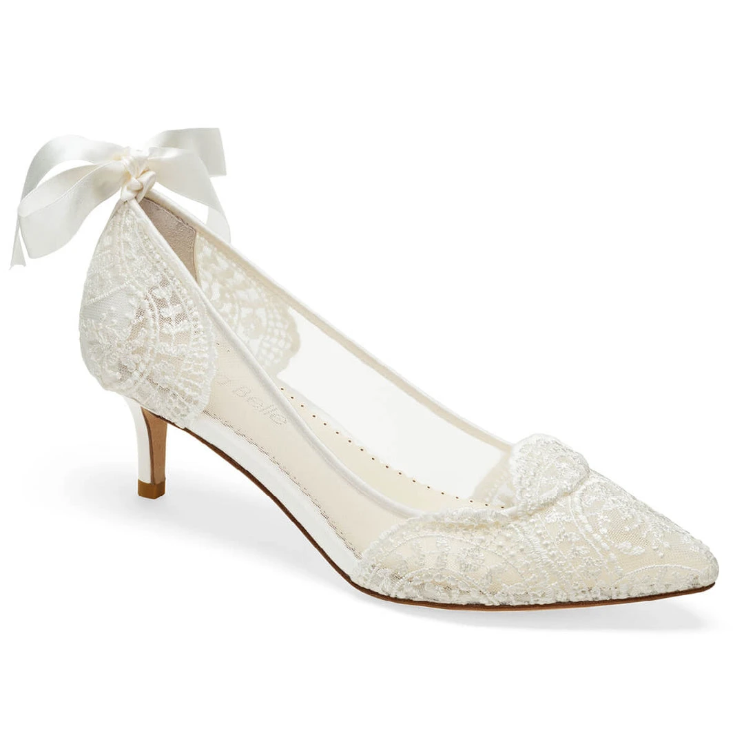 Classic pumps don’t have to be boring! For our Greta embroidered lace bridal shoesย by Claire Pettibone, Claire chose one of her favorite French embroidery patterns with a gorgeous scalloped edge to embellish this design. The silk ribbon bow is a nod to the iconic ballerina. One of Claire’s favorite elements is that the bow is removable, so you could choose a streamlined look without it or customize it with your own ribbon if you want to get creative with the signature color for your wedding heels with ribbon tie. You could even use this as a place to incorporate an heirloom piece by creating a bow of antique fabric for a boho wedding.