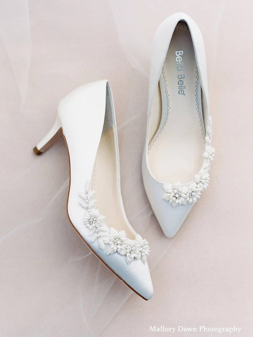 The perfect, chic kitten heel wedding shoes ivory in color, re-imagined and re-defined. Teardrop luminous pearls and ivory beads are embellished in the shape of flowers and vines sweeping up to the side of these white pearl wedding shoes. The 3D ivory blooms and vines provide textural contrast to the classic ivory silk. These satin wedding shoes low heel in design bring comfort to this statement making heel.