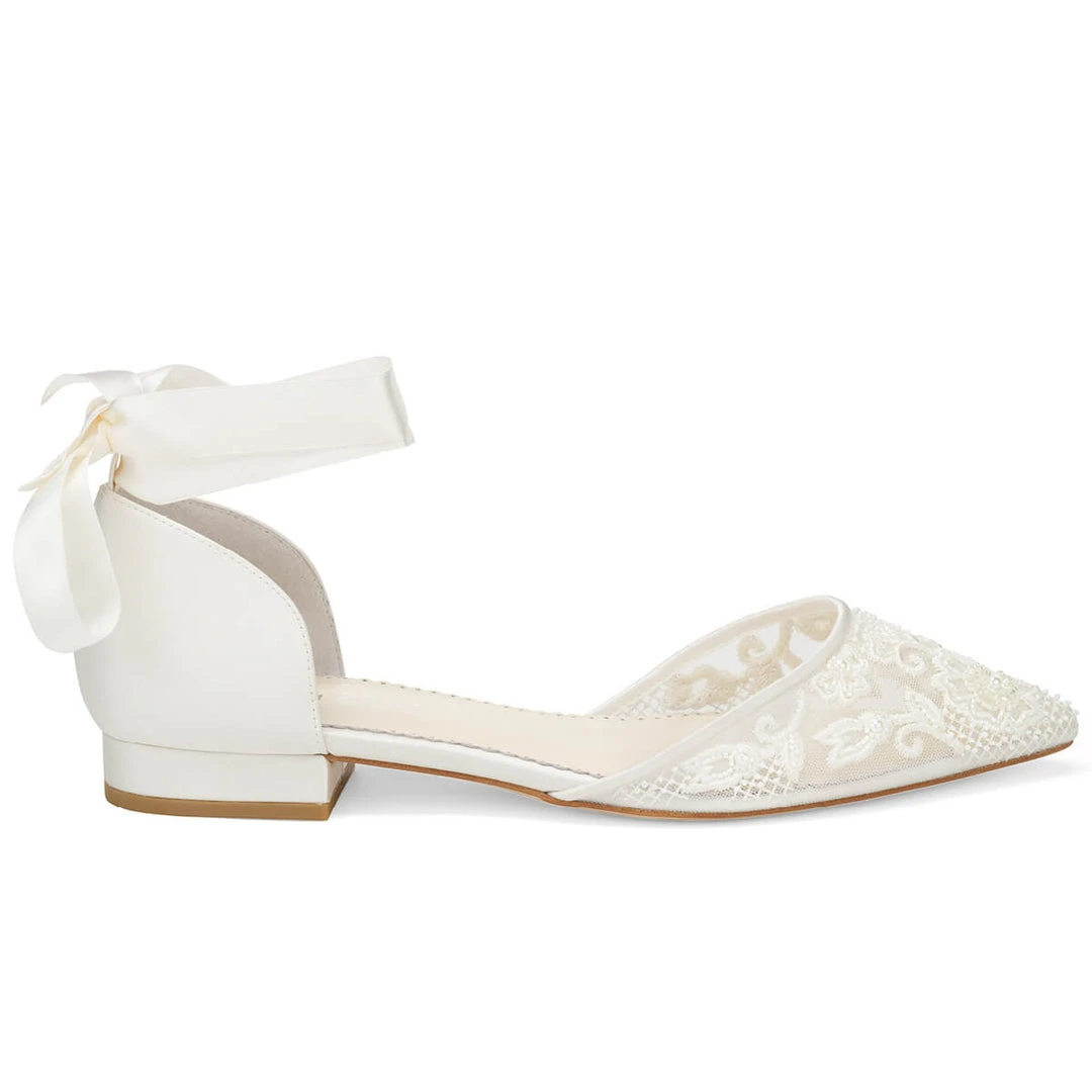 Silky ivory ribbons caress the leg, reminiscent of a traditional ballet slipper on these pearl wedding flats with pearls. Delicately loop the ribbons around your ankle and knot the ends into a trim bow. Only the most discerning observer will spot the pearl beads incorporated into the floral lace design.