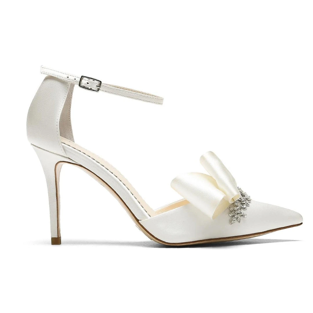 The Marlene heel has star-quality oomph for those who don’t shy away from flashy chutzpah. Dazzling crystal jeweled flowers at the toe are offset with asymmetrical bows. The structural pleats of the layering silk bows make this shoe a talk of the town. Fill your day and evening with radiance, every sparkling step of the way.