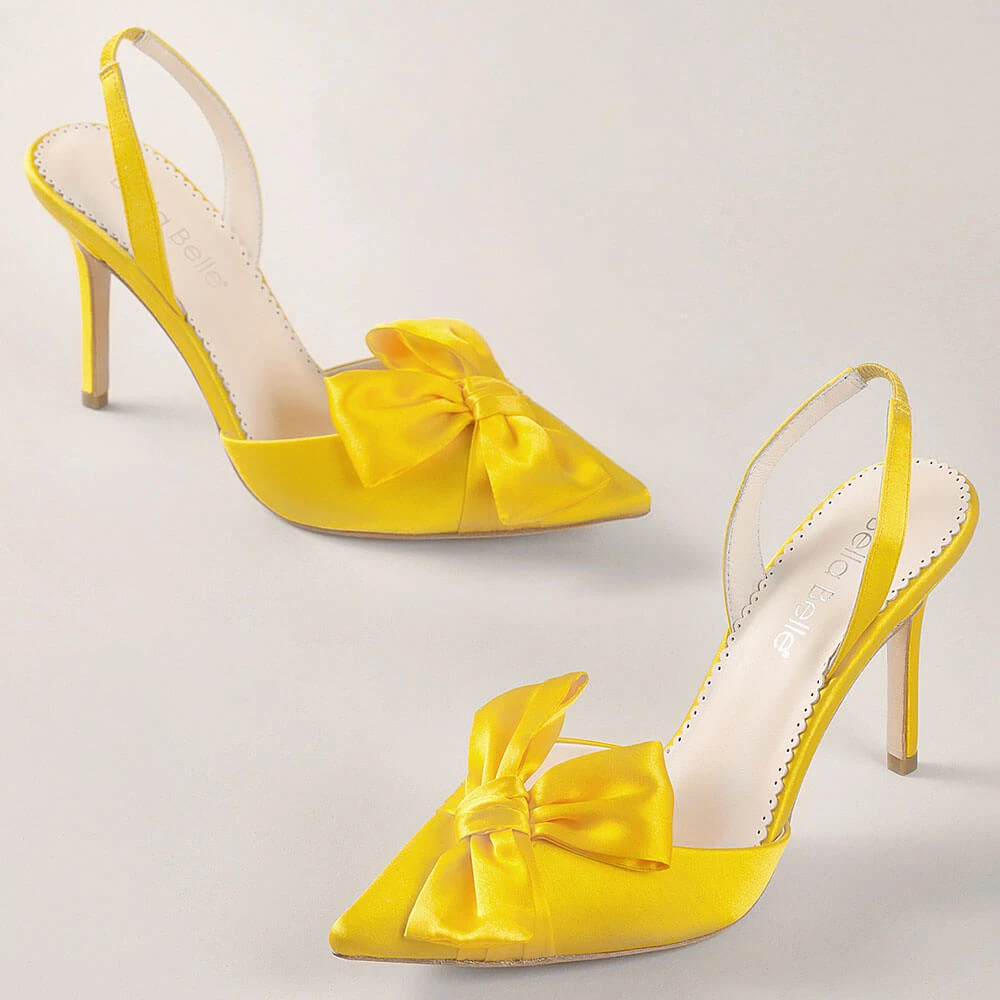 This vivid yellow slingback pointed toe heels with asymmetrical bow detailing is the perfect modern heel. The vivacious color represents strength and adds an understated polish to these clean-cut pointed toe pumps with bow detailing. The pointed toe is complete with a knotted silk bow at a diagonal.Â